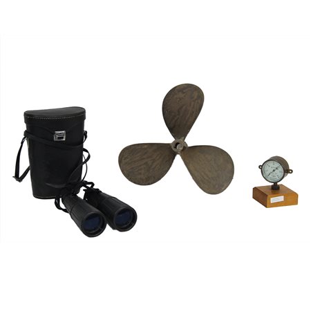 LOTTO DI 3 OGGETTI VINTAGE DI CUI un'elica da barca in ottone, un manometro pressione olio originale Franco Tosi Legnano in ottone con base in legno e un binocolo con custodia in pelle nera. Italia XX secolo misure varie