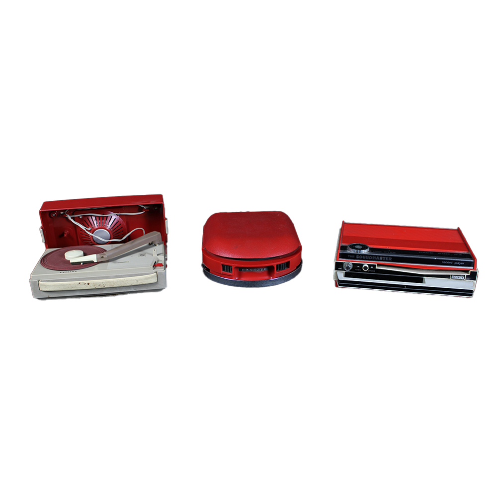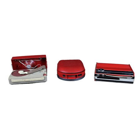 LOTTO COMPOSTO DA 3 GIRADISCHI in plastica di varie forme e misure e tutti di colore rosso (il funzionamento non è stato testato) marcati uno The sound master , uno Philips ed uno Foxette periodo stimato anni 60 misure varie