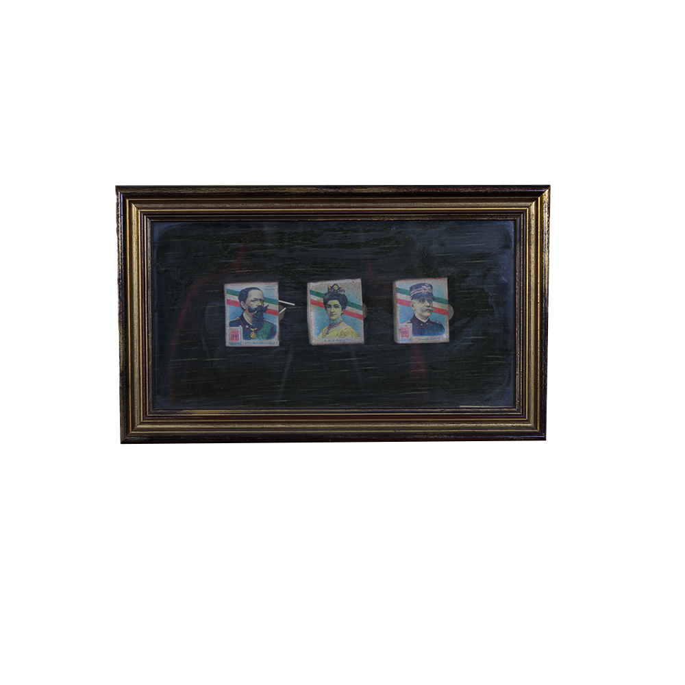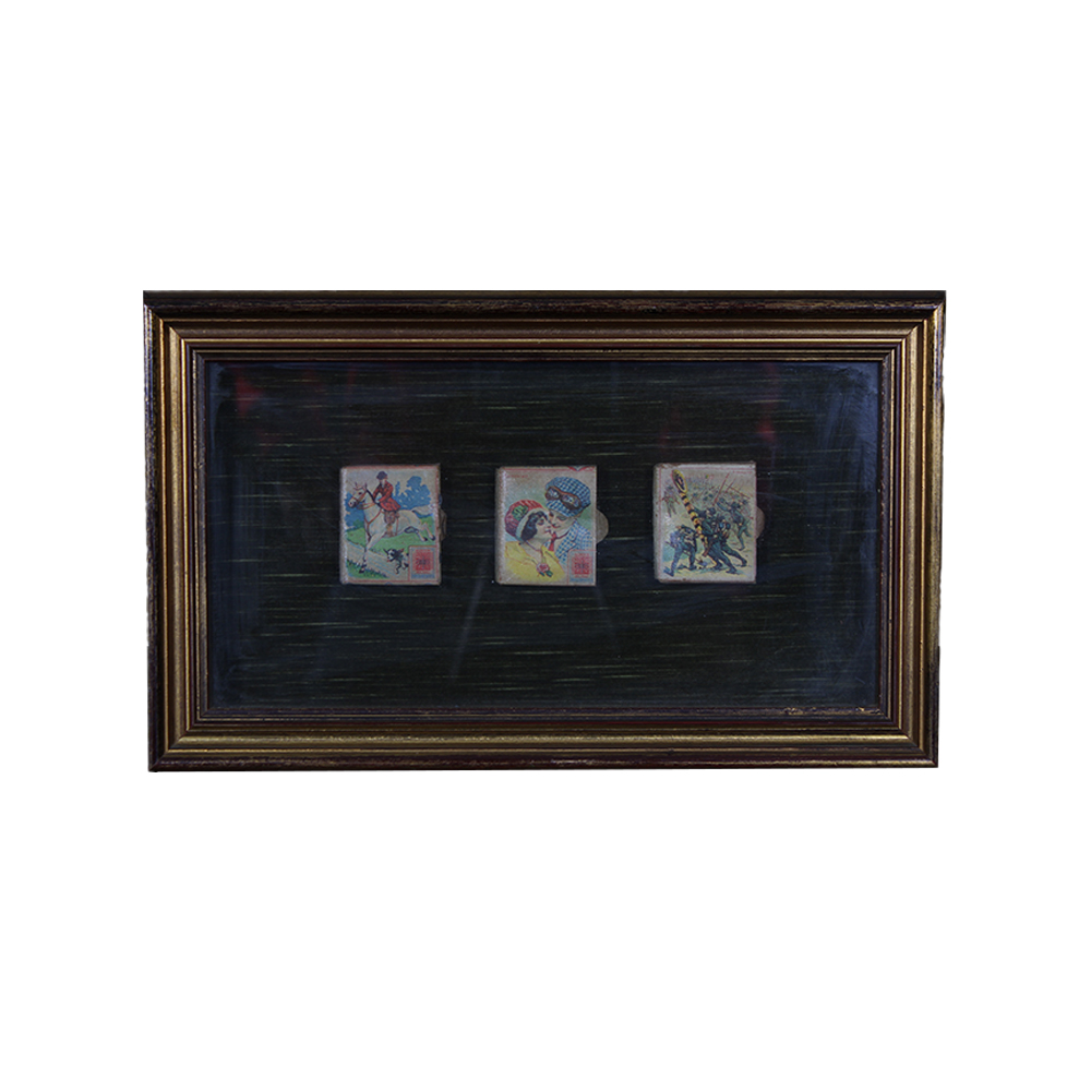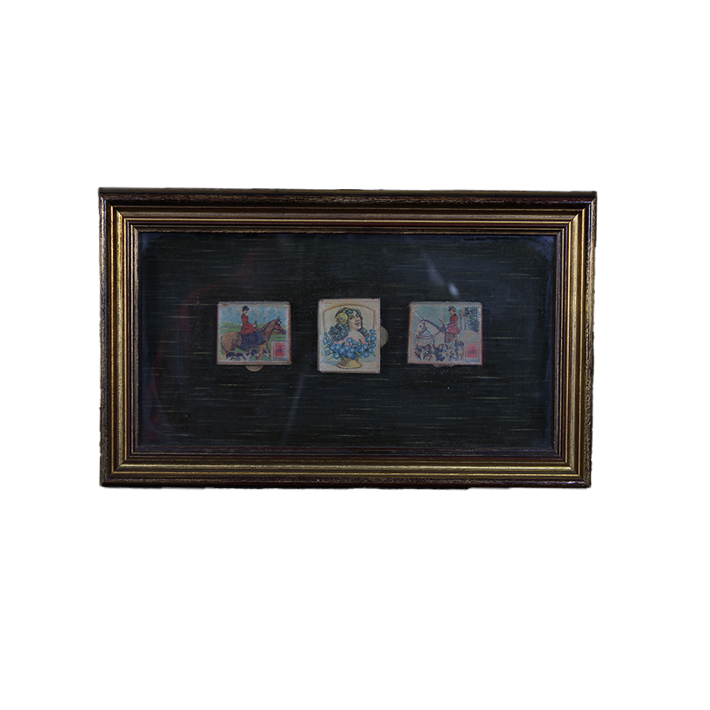 LOTTO DI 3 QUADRETTI TECA con cornice in legno dorato, contenenti ciascuno 3 scatole di fiammiferi d'epoca. Italia prima metà del XX secolo h cm 21 x 35
