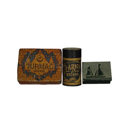 LOTTO DI 3 SCATOLETTE VINTAGE TURMAC ORANGE per tabacco Clarion record per fonografo e una scatoletta in metallo raffigurante barche. Usure del tempo. Diversi materiali. Italia XX sec misure varie