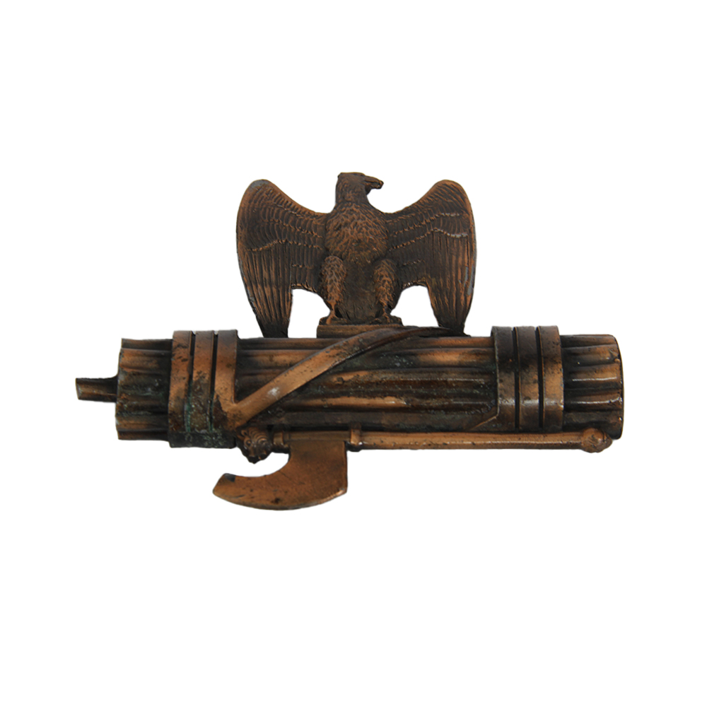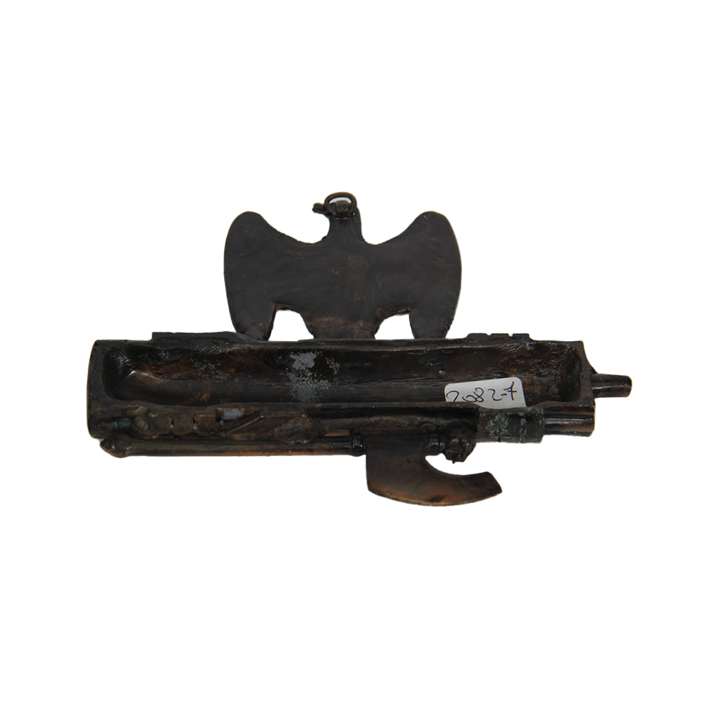 PLACCA in rilievo in metallo raffigurante simbologia iconica fascista. Italia metà del XX secolo h cm 13 x 15