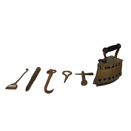 LOTTO COMPOSTO DA 5 oggetti caratteristici da lavoro contadino e 1 ferro da stiro d'epoca in ferro. Primi del 900 misure varie