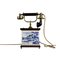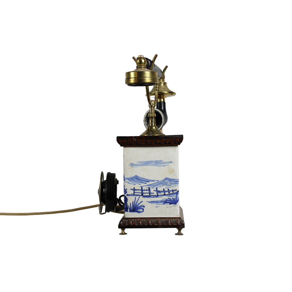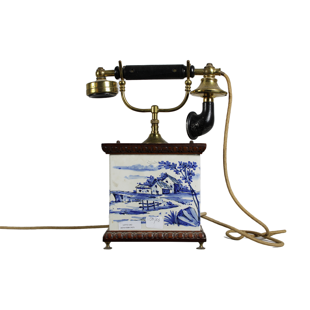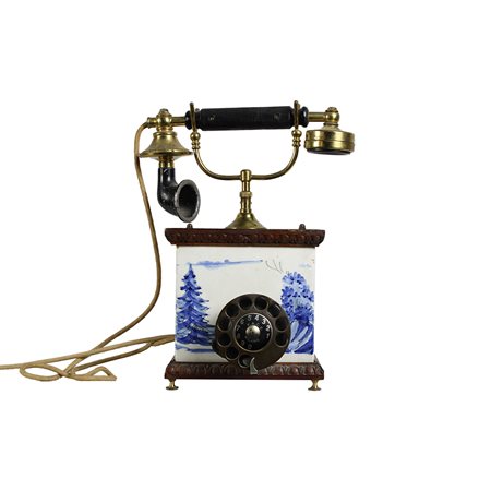 TELEFONO VINTAGE in maiolica dipinta, legno e metallo XX secolo h cm 33 x 26 x 18