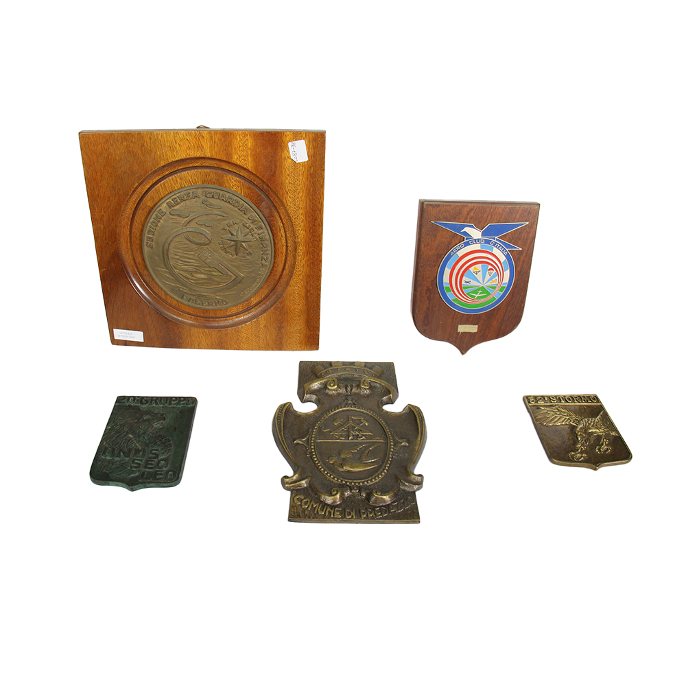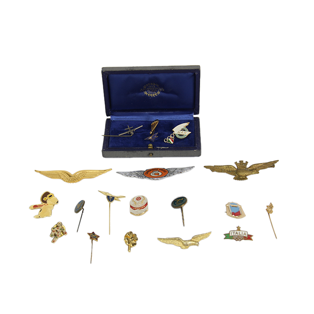 LOTTO COMPOSTO DA 5 placche in metallo e cofanetto con 20 spille dell'Aviazione Italiana. Italia XX secolo misure varie