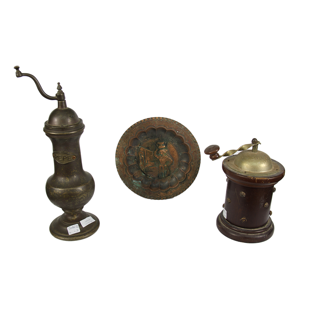 LOTTO COMPOSTO DA 1 macinapepe d'epoca in bronzo 1 macina caffè in legno ed ottone e un piattino ricordo dell'Abruzzo in rame. Italia metà del XX secolo misure varie