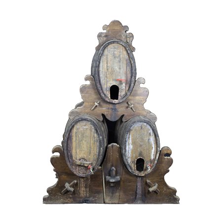 GRUPPO DI TRE BOTTI realizzate in legno di rovere, sostegno a piramide in legno di noce alla maniera fratina Sicilia XX secolo h cm 208 x 160 x 100