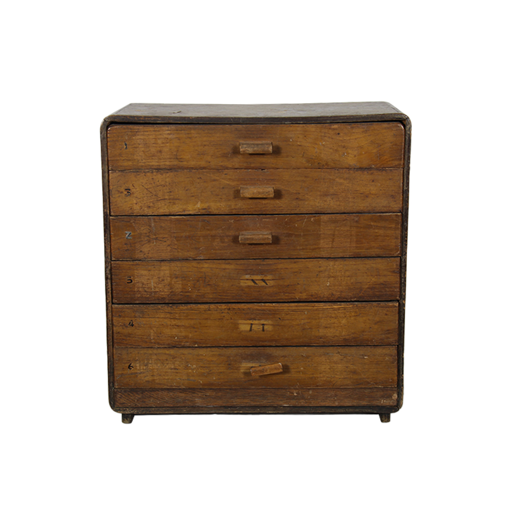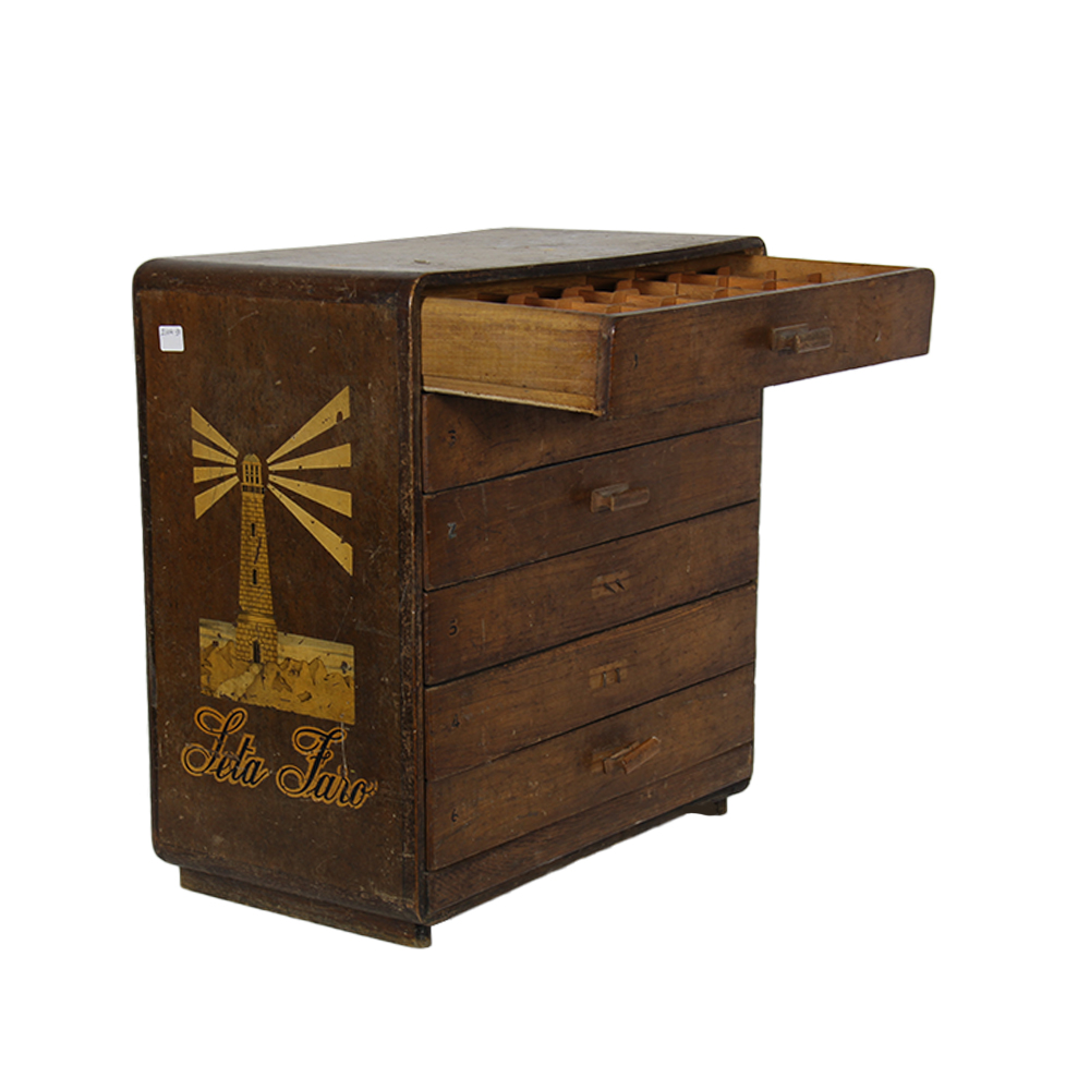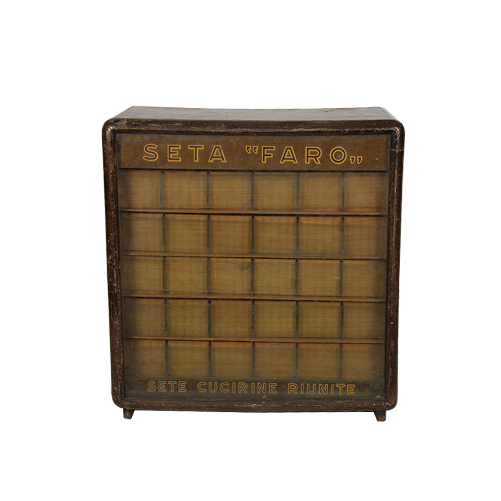 CASSETTIERA in legno per sartoria italiana Seta Faro. Usure e mancanze. Italia anni 60/70 h cm 45 x 42 x 27