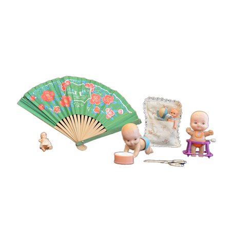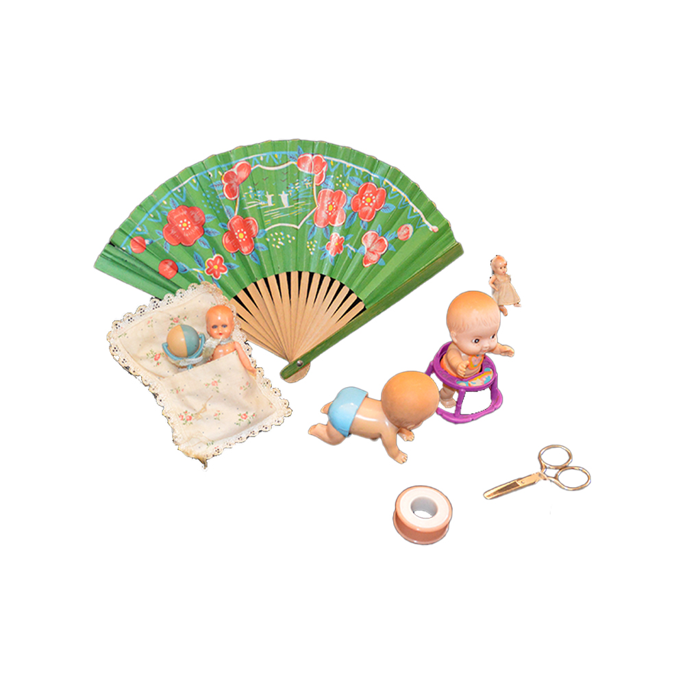Accessori piccoli giochi per bambola n. due bambolotti in bachelite, n. uno ventaglio, n. due neonati a molla in bachelite, una forbicina da ricamo provenienza varie anno 1980