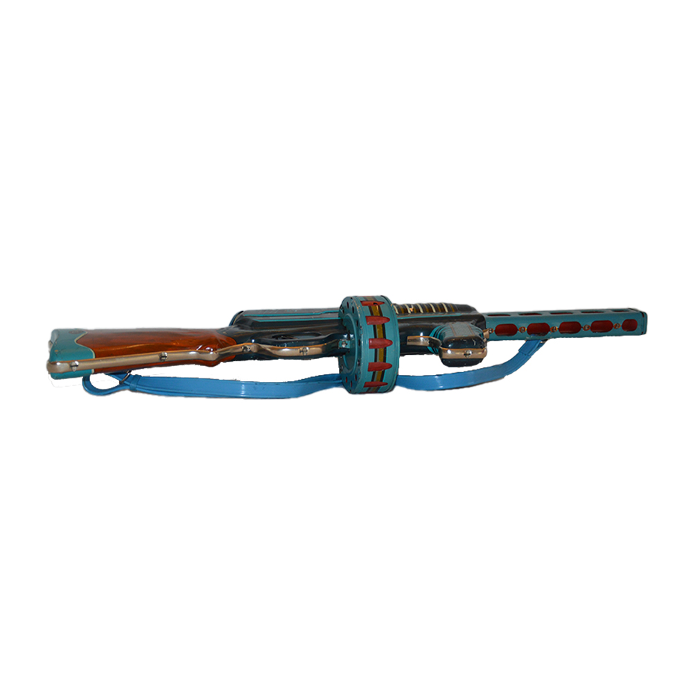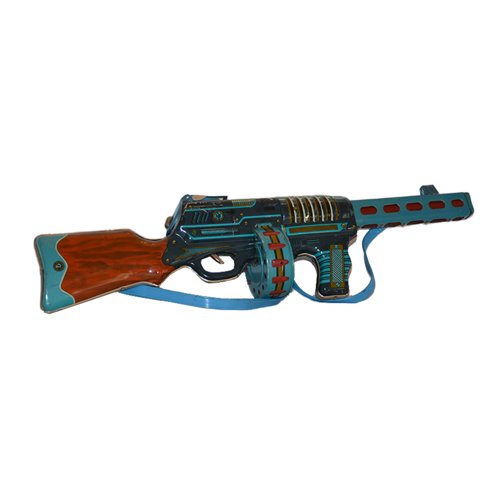 Mitragliatore giocattolo Gioco mitragliatore in latta serigrafata, in ottime condizioni, funzionamento a batteria, con cinghia, provenienza Cina anno 1980. h cm 13 x 8 x 53