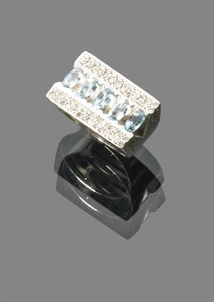 ANELLO Anello in oro bianco di forma rettangolare con incastonate acque marine e doppia fila di diamanti taglio brillante per complessivi ct 1,20 ca Peso gr 16,30 Rectangular white gold ring with a row of acqua marines and a doule row of brillant cut diamonds totaling approx 1,20 kt Weight 16.30 gr