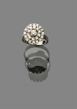 ANELLO Anello in oro bianco con diamante taglio brillante di ct 0,25 ca contornato da doppia fila di diamanti taglio brillante per complessivi ct 1,00 ca Peso gr 4,70 Ring in white gold with brilliant cut diamond of approx 0.25 ct, surrounded by two rows of brilliant cut diamonds totaling about 1.00 ct Weight 4.70 gr