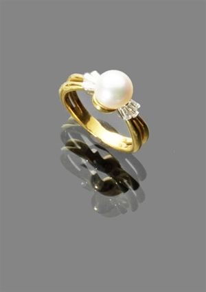 ANELLO Anello in oro giallo con perla giapponese e sei diamanti taglio trapezio per complessivi ct 0,12 ca Peso gr 6,30 yellow gold ring with japanese pearl and 6 trapazioid cut diamonds for approx total of 0,12 kt Weight 6.30 gr
