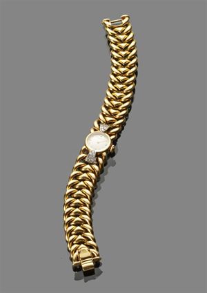 BRACCIALE Bracciale in oro giallo con orologio Vacheron & Constantin cassa in oro con incastonati diamanti vecchio taglio per complessivi ct 0,50 ca Peso gr 81,40 vacheron & constantin watch with gold bracelet and antique cut diamonds approx total 0,50 kt Weight 81.40 gr
