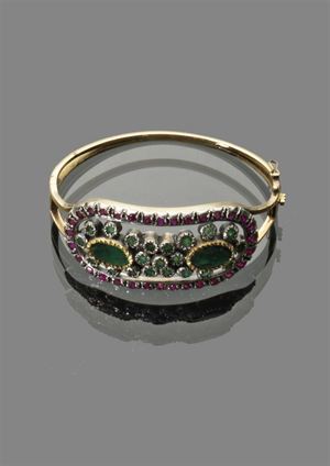 BRACCIALE Bracciale rigido in oro a basso titolo con riporto in argento con incastonati smeraldi e rubini Peso gr 39,20 lowgrade gold bangle with same silver and emeralds and rubies. Weight 39.20 gr