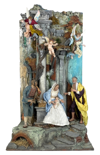Particolare presepe di manifattura napoletana con parti in ceramica dipinta e materiali sintetici dipinti,