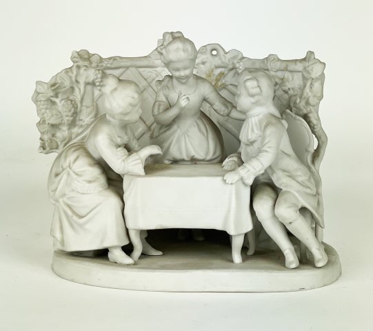 Elegante portacarte in porcellana biscuit raffigurante una scena di dame e gentiluomini.