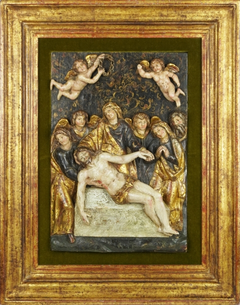 Interessante rilievo in legno policromo di scuola italiana, presumibilmente risalente alla fine del 16° secolo.