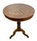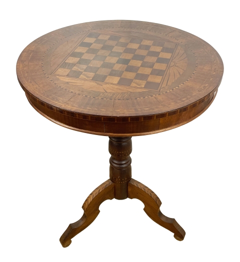 Mobile con base in noce, piano rotondo impiallacciato con intarsi policromi.