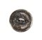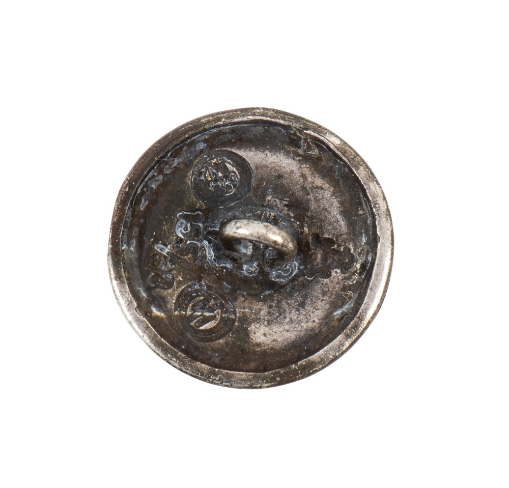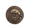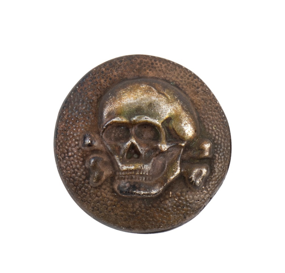 Raro bottone in metallo bianco con teschio in rilievo, marcato al verso, in patina