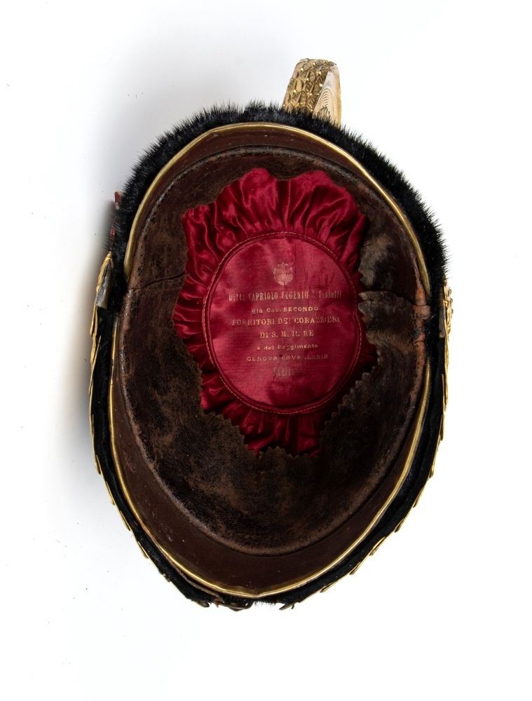 Elmo con coppo e croce frontale in metallo argentato, cimiero e soggoli dorati, corpo ricoperto di pelo, interno con cuffia di seta es alluda in pelle; in ottimo stato.