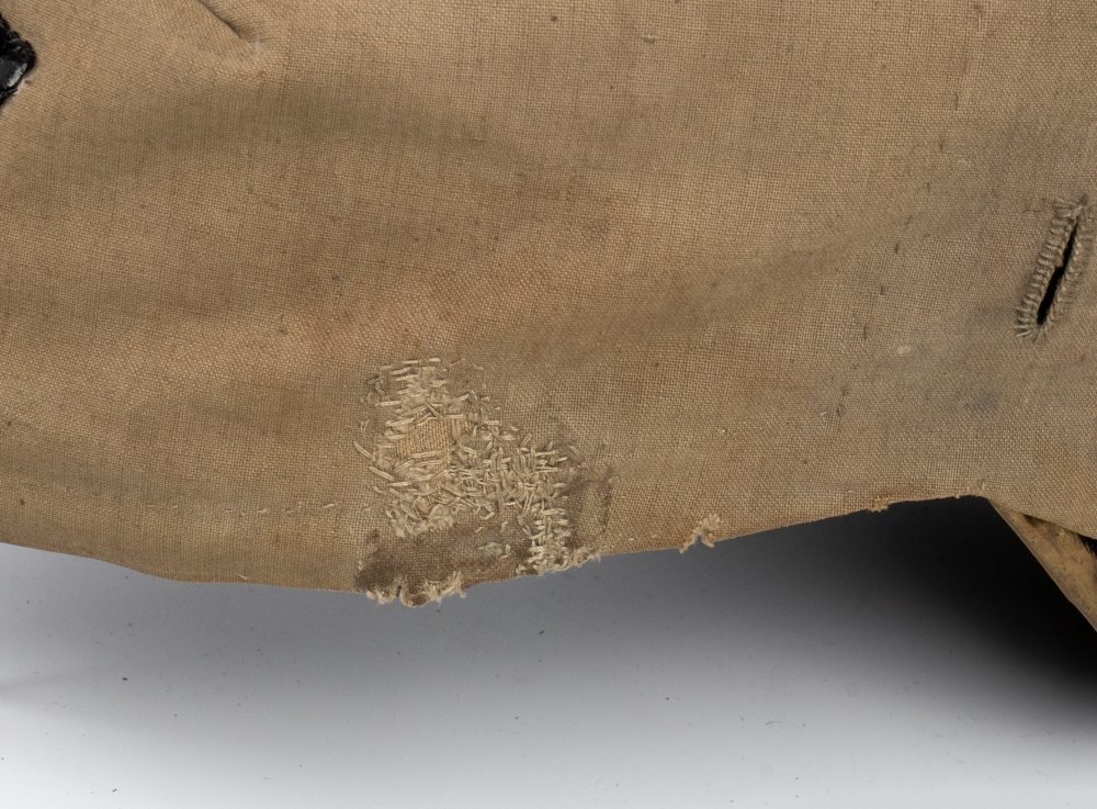 Elmo da dragone in medie condizioni con bella copertura in tela di cotone grigioverde, in buono stato.