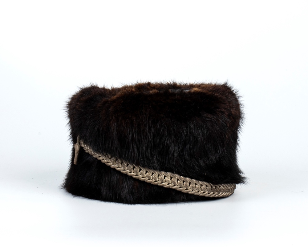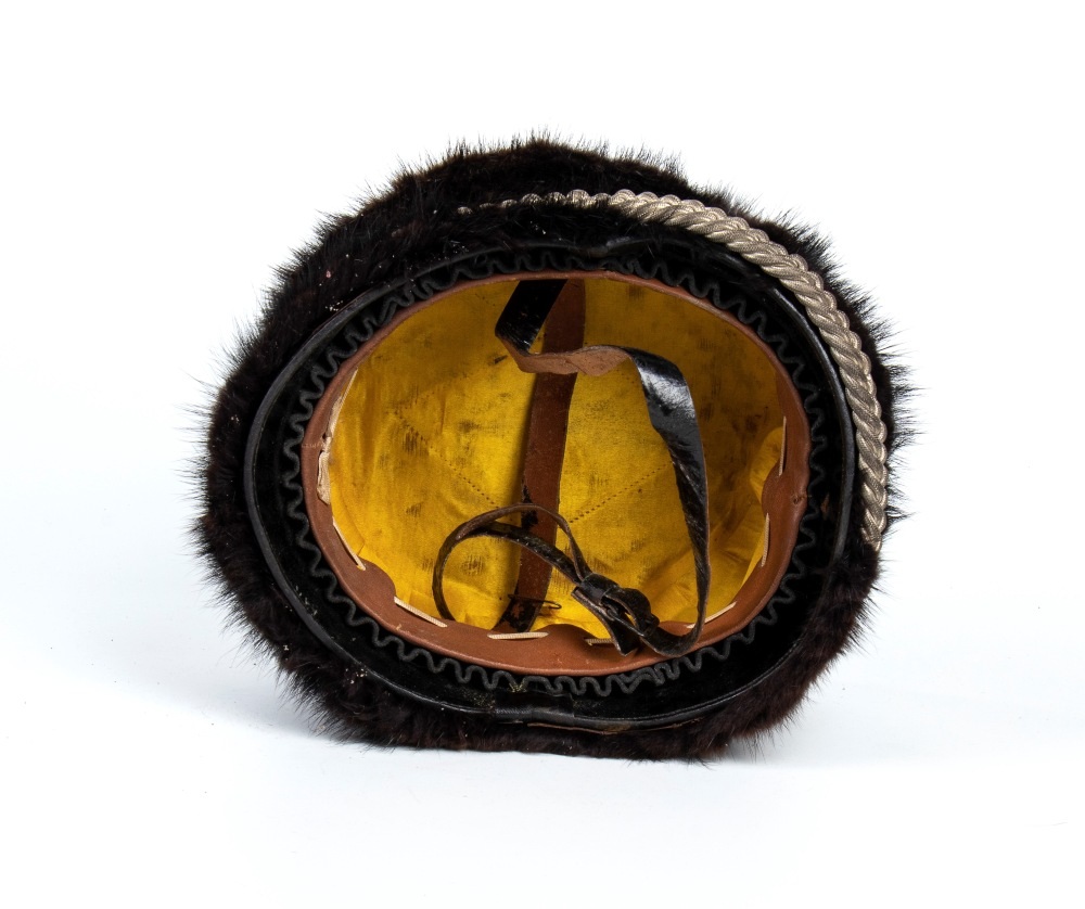 Fusto rigido ricoperto di pelo con imperiale di pelle, fregio frontale e nappina in metallo argentato, cordoni tubolari argentati; in ottimo stato, molto bello.