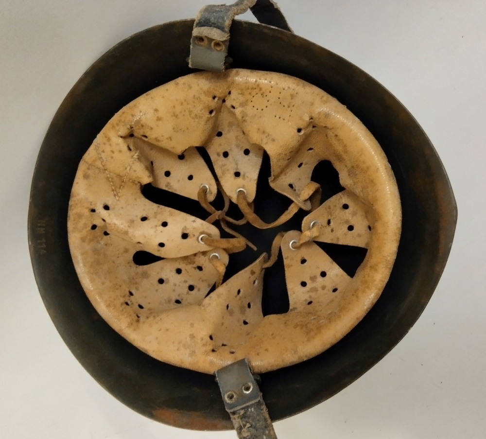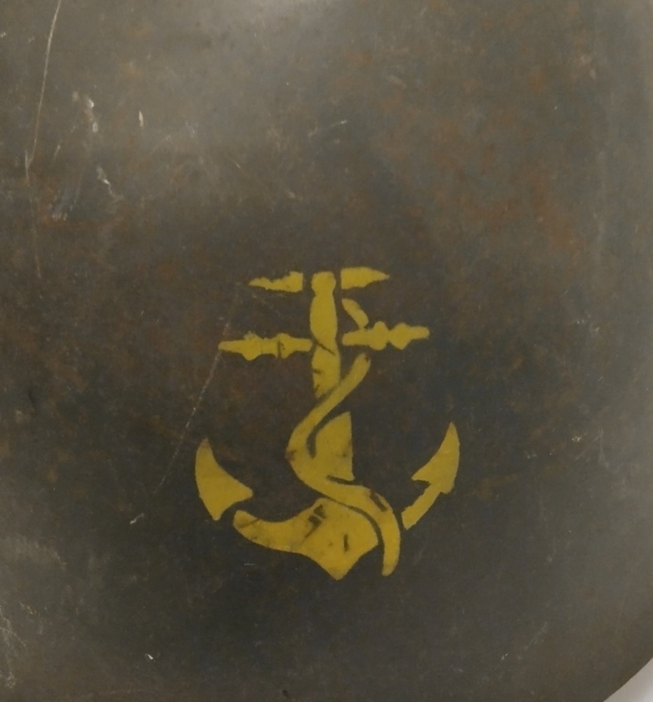 Elmetto da marò della Marina Nazionale Repubblicana. Ancora frontale con corona asportata e scudetto tricolore sul lato destro dell'elmo, interno in pelle chiara, soggolo grigioverde; in buono stato.