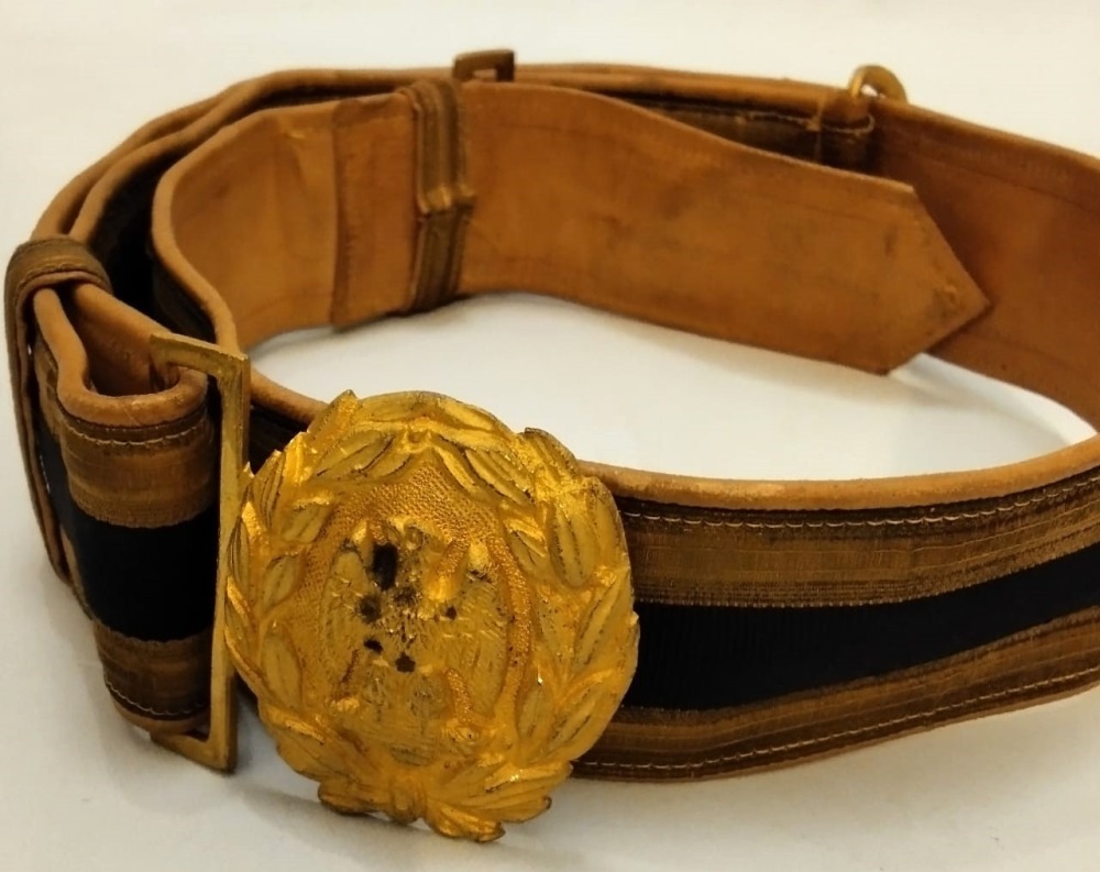 Cinta in broccato oro nero su pelle bianca, fibbia in bronzo gettato e dorato, aderente al regolamento del 1931 per tutti gli ufficiali della MVSN. In ottimo stato.