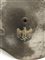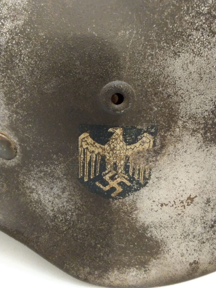 Elmetto m.40 con vernice feldgrau e spruzzate di vernice bianca. All'elmetto è stato asportato lo scudetto con aquila. In buono stato, senza soggolo.
