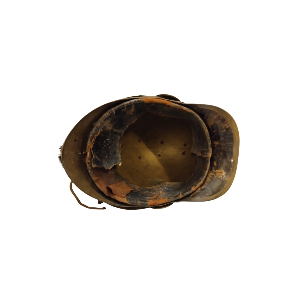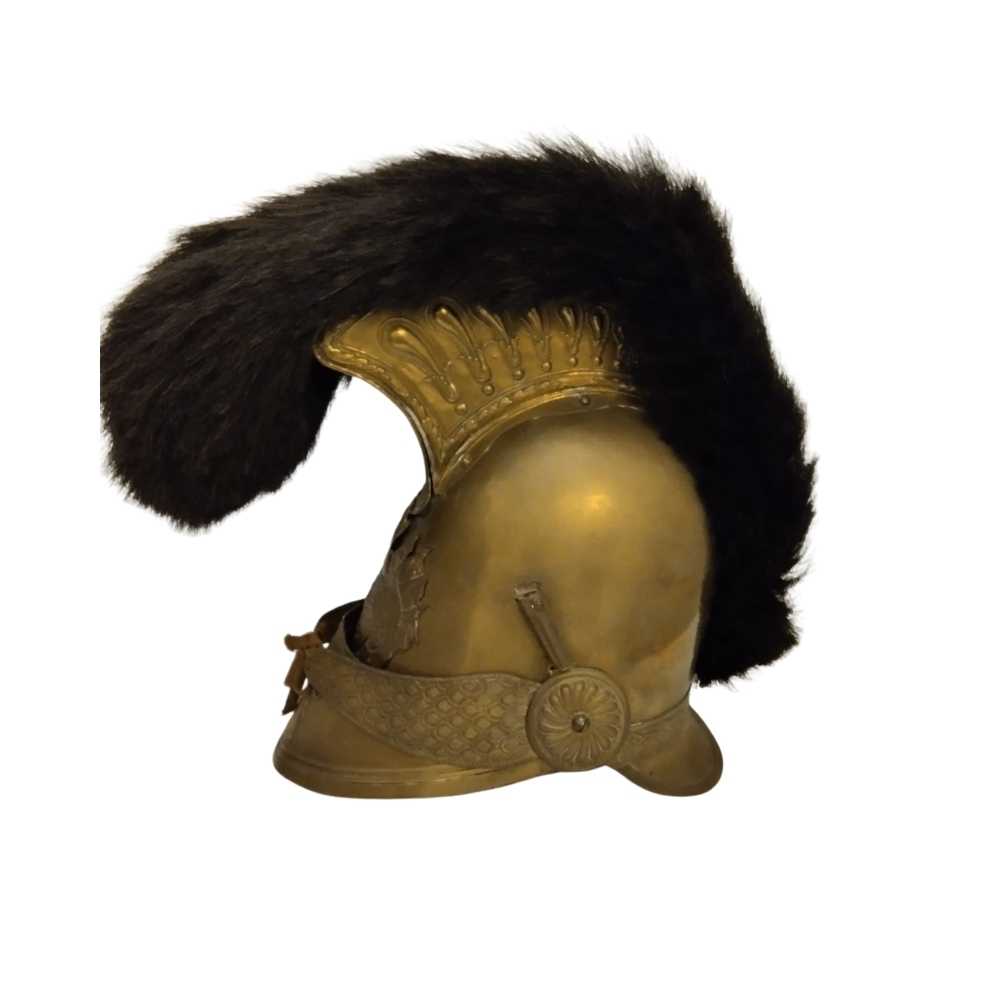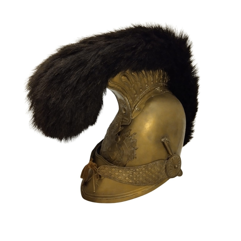 Bellissimo ed imponente elmo da Sapeurs Pompiers in ottone; cimiero ornato di foglie di acanto, completo di interno e visiera mobile. In ottimo stato.