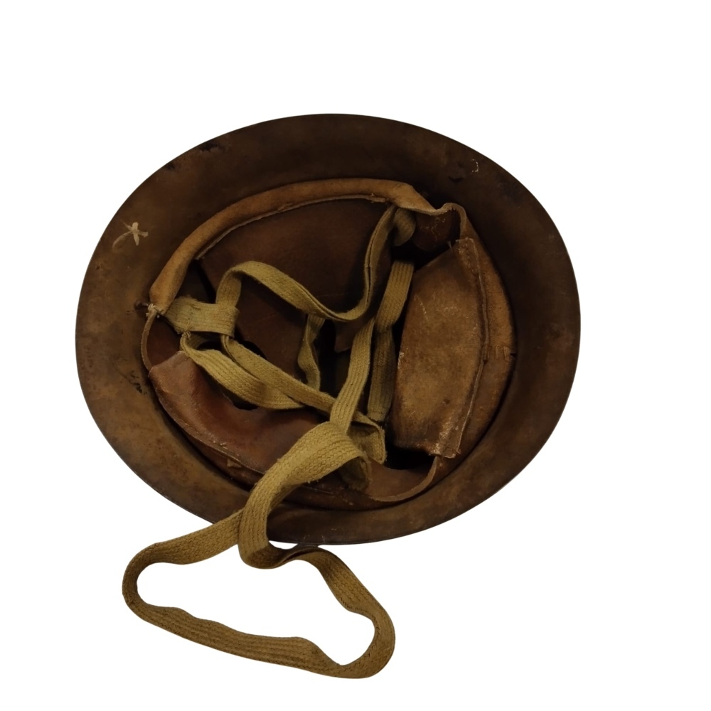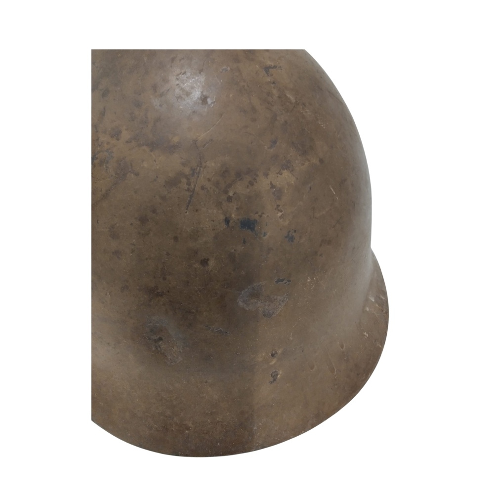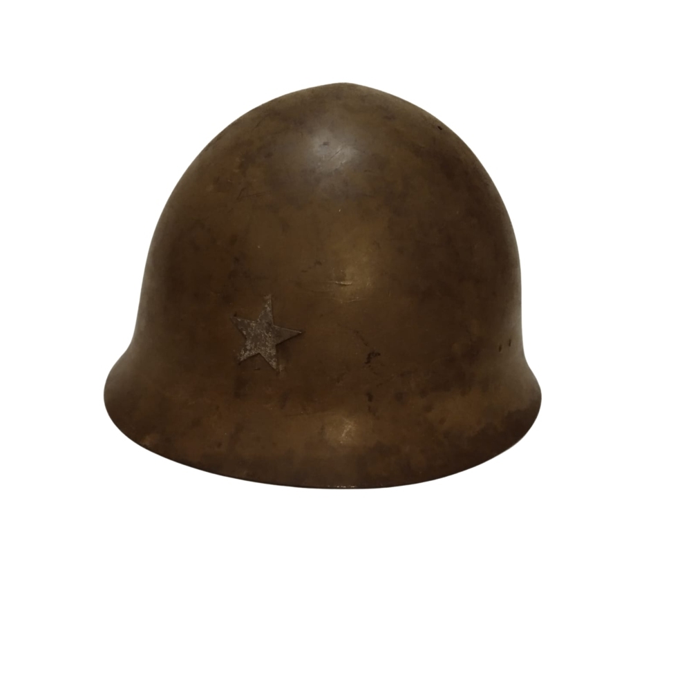 Elmetto in acciaio dell'Esercito Imperiale Giapponese utilizzato nel secondo conflitto mondiale. Noto come m.90, in acciaio verniciato caki, interno di tela e pelle. In buono stato con ammaccatura danno di battaglia; molto bello e interessante.