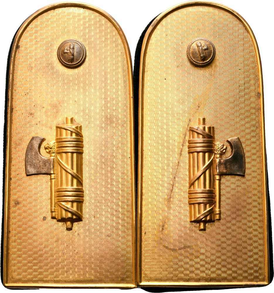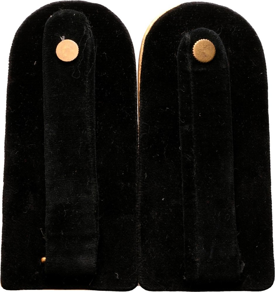 Belle controspalline in metallo per l'alta uniforme di un ufficiale inferiore della MVSN, lamierino di ottone stampato e dorato con applicati fasci littori, foderate di velluto di seta nera, complete di bottoni. In ottimo stato.