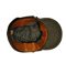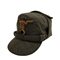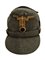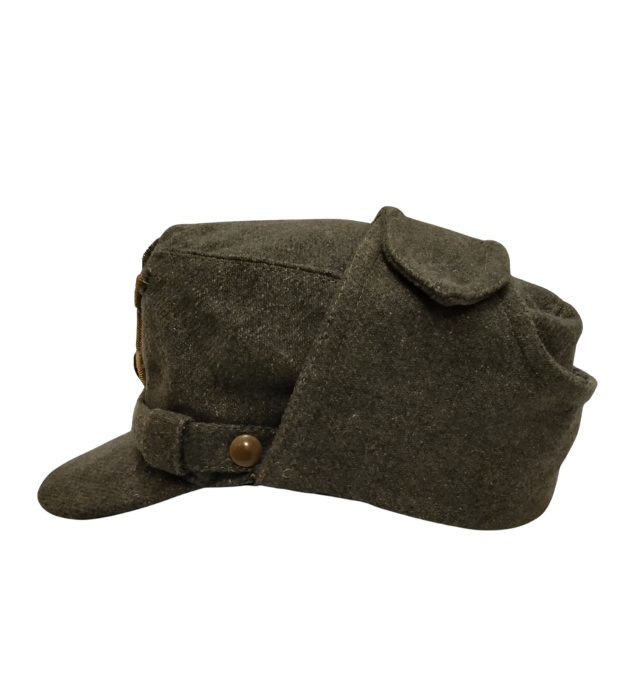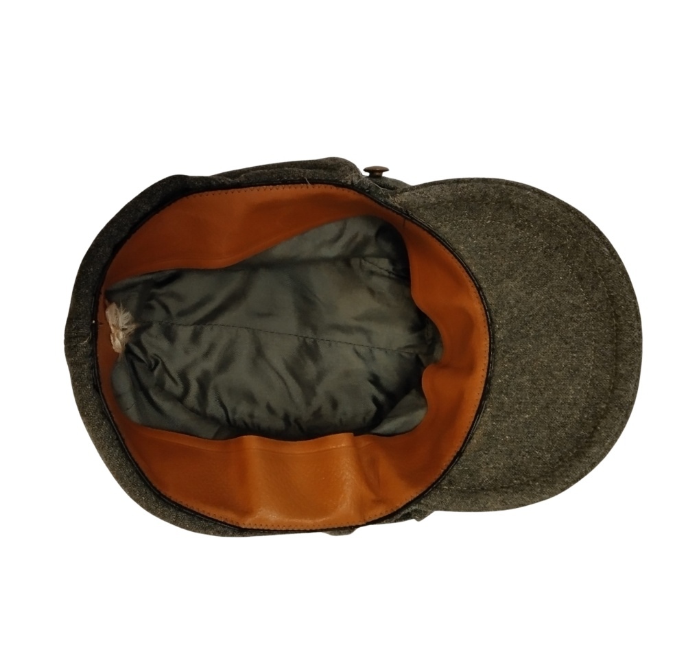 In lana grigio verde con frontino rinforzato e bel fregio frontale, interno di cotone, in ottimo stato, rara.