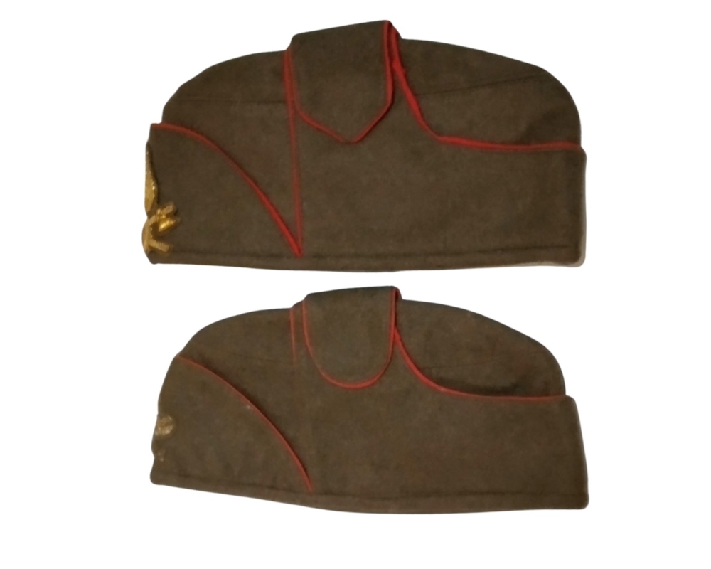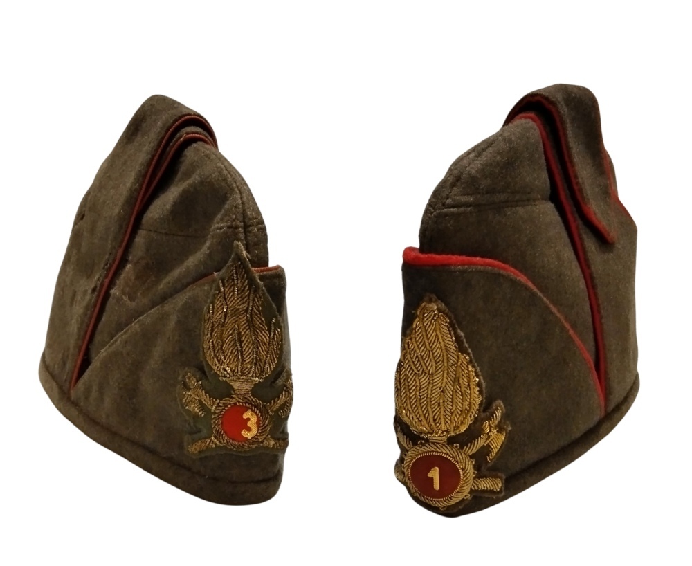 In lana caki profilate rosso scarlatto, fregio frontale di canottiglia dorata. In ottimo stato.