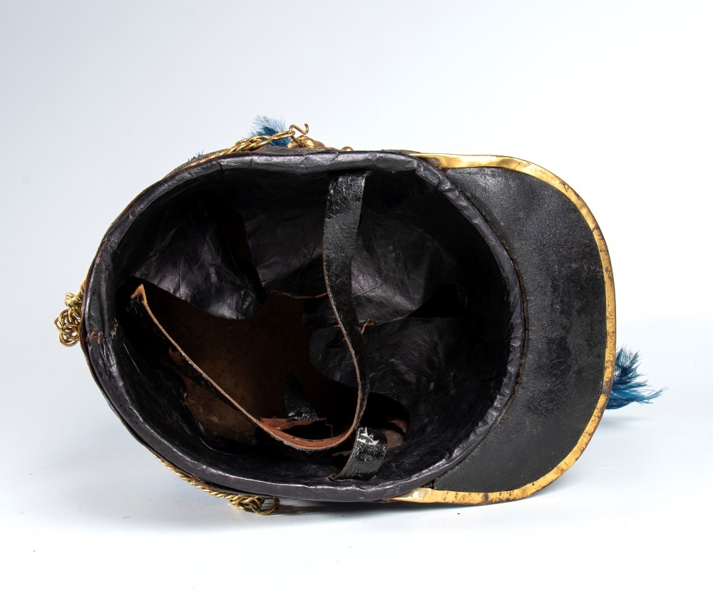 Fusto rigido ricoperto di fine panno azzurro con rinforzi di cuoio, bel fregio in metallo dorato; completo di nappina ed accessori. Rarissimo e in ottimo stato.