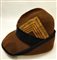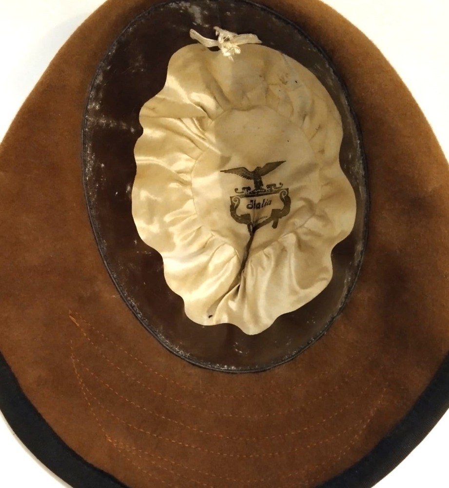 Bellissimo cappello all'alpina da Console comandante Legione di CCNN in Africa. Feltro marrone bordato di nastro in seta nera, bel fregio ricamato di canottiglia dorata su fondo robbio col numero della Legione nella targhetta centrale. Interno in seta bianca con marchi del fabbricante. In ottimo stato. Molto raro.