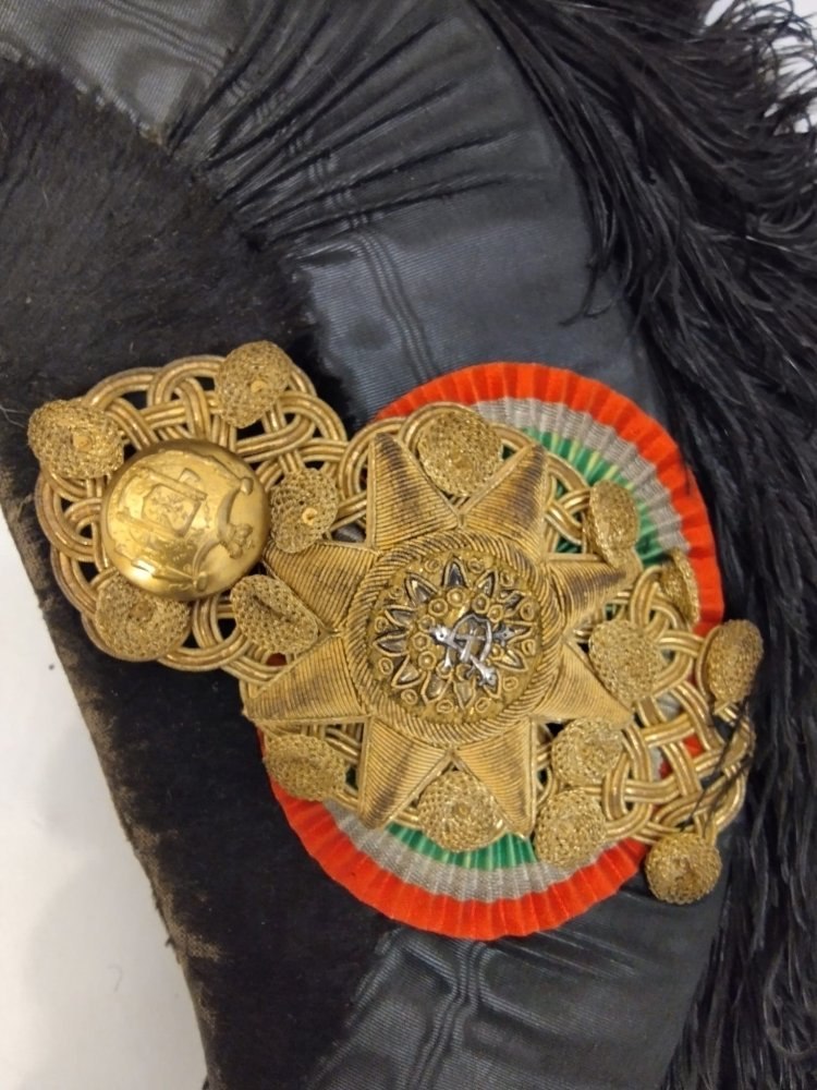 Bellissima uniforme da funzionario di alto grado equiparabile a quello di Console del Regno d'Italia e di Albania, composto da giacca ornata da eleganti ricami in canottiglia con particolari bottoni con aquila bicipite albanese accostata a fasci, pantaloni con banda in oro e feluca di feltro ornata di piume nere di struzzo con coccarda cappio e bottone metallico con particolare fregio albanese. In ottimo stato, molto rara.