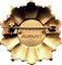 Metallo dorato e pietre incastonate sul perimetro dello stemma nazionale e sui raggi in metallo argentato; in ottimo stato.