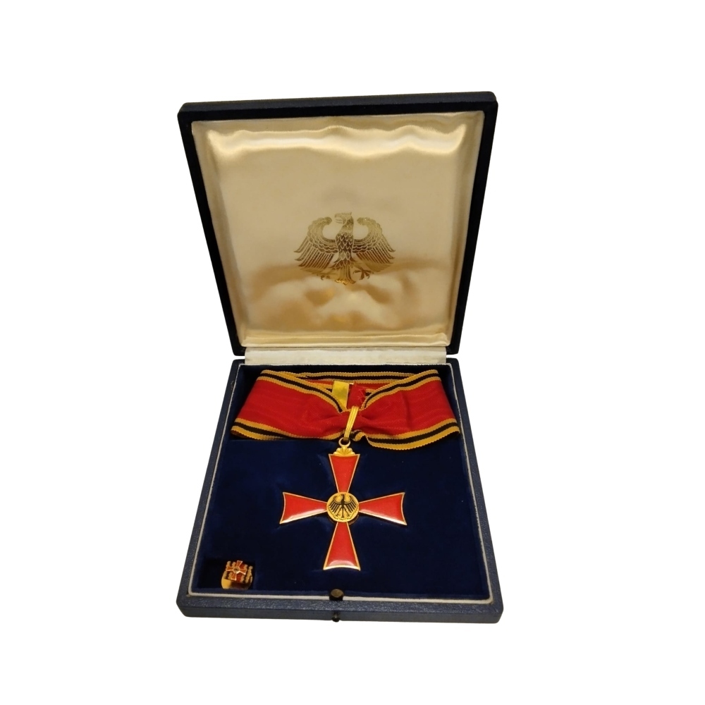 Insegna di commendatore dell'Ordine al Merito della Repubblica Federale tedesca, in argento dorato e smalti policromi, conservata in astuccio. In ottimo stato.