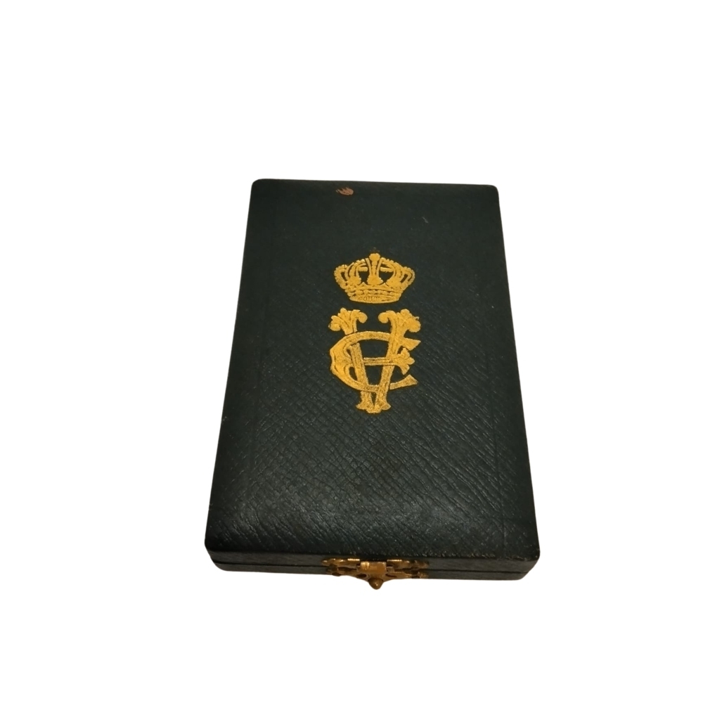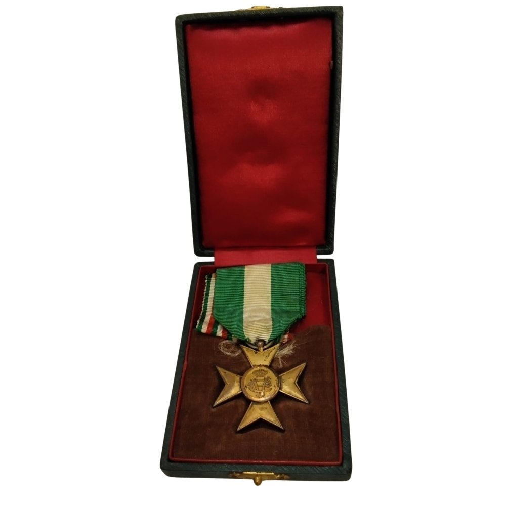 Croce di Anzianità per venticinque anni di servizio nel Regio Esercito , in metallo dorato con nastro originale, conservata in astuccio