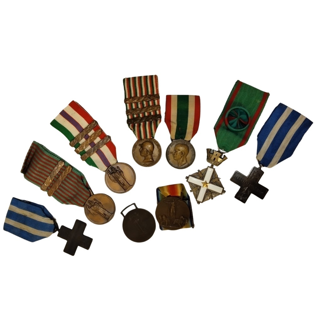 Lotto composto da otto medaglie, una commemorativa la grande guerra con tre barrette, una guerra di liberazione con tre barrette, una campagna 40-45 con due barrette,due croci al merito di cui una RI e una VE,due interalleate di cui una senza nastrino e una unità d'Italia coniata ad opera dell'ass naz madri e vedove di guerra, in buono stato