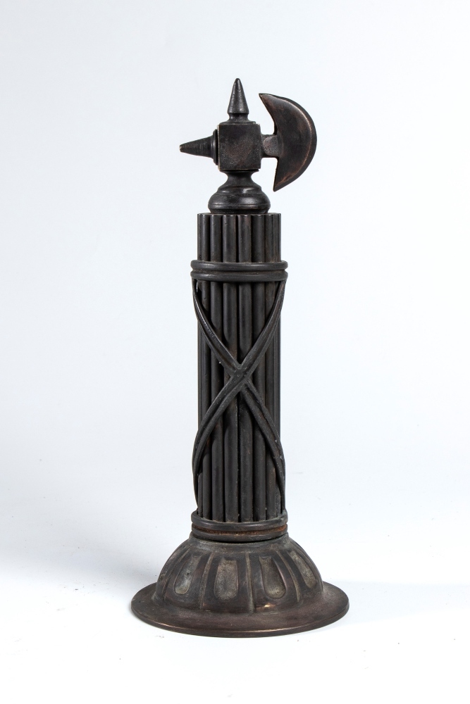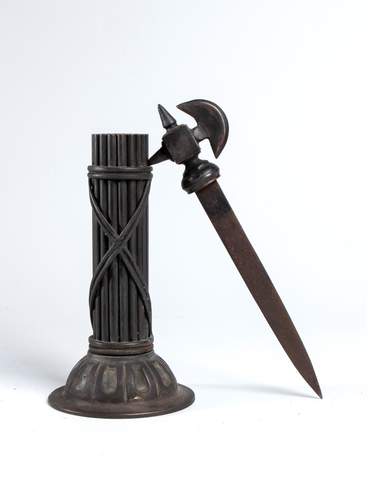 Bellissimo tagliacarte con lama in ferro e manico a forma di ascia con fodero a verghe per formare un fascio repubblicano a tutto tondo. Molto interessante, in ottimo stato.