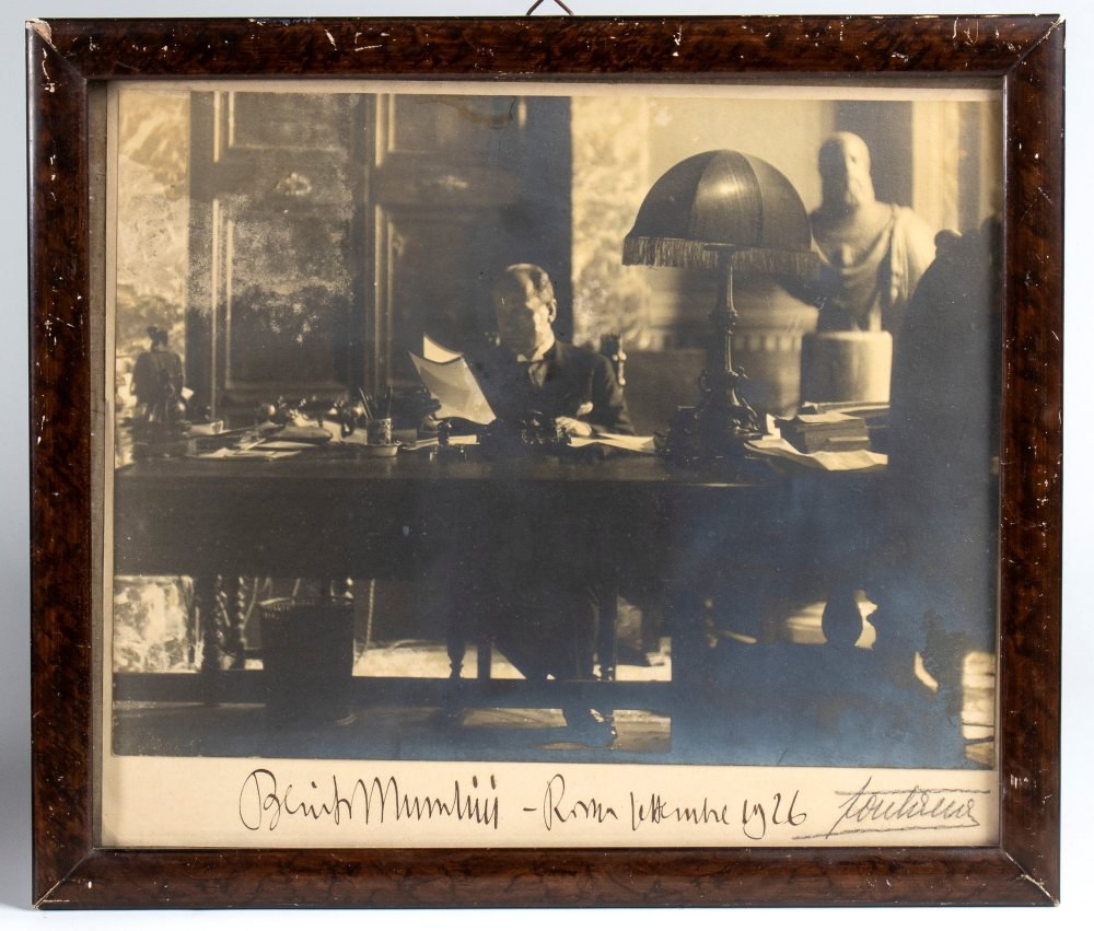 Ritratto di Benito Mussolini alla scrivania nello studio di Piazza Venezia con firma autografa e data settembre 1926. In cornice coeva e in buono stato.