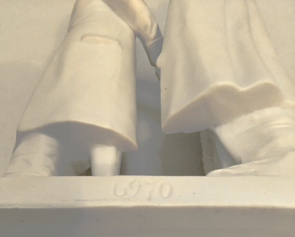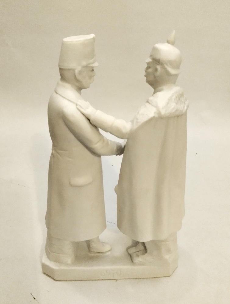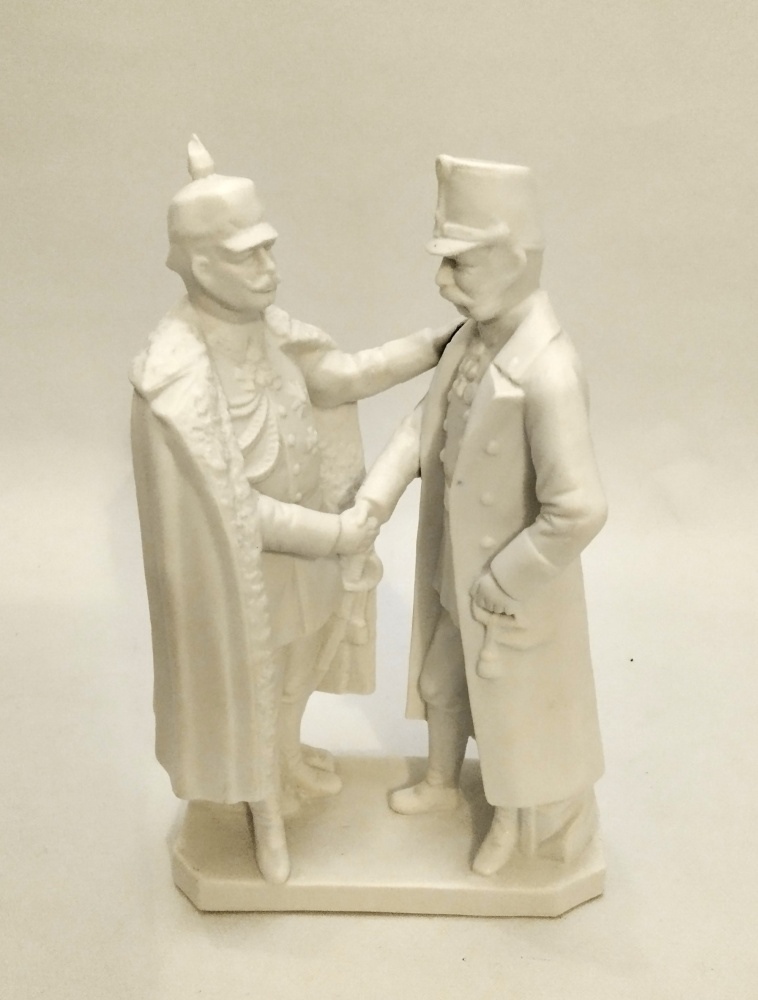 Scultura in bisquit rappresentante gli imperatori Guglielmo II e Franz Joseph in atto di stringersi la mano; integra.