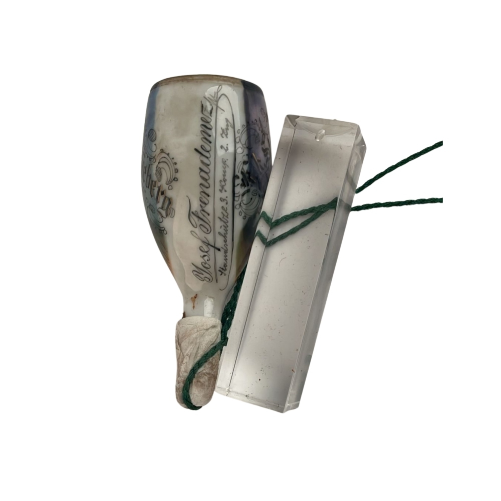 Pipa in ceramica del battaglione Standschutzen Enenberg, noto per aver combattuto sul fronte dolomitico di Cortina d'Ampezzo. Decorazione  con allegoria dell'Italia in abiti muliebri attaccata da aquile austro-tedesche (una con doppia testa e una imperiale tedesca). Presenta il nome del proprietario, Joseph Frenademez, Standschutze 3° compagnia, 2°plotone