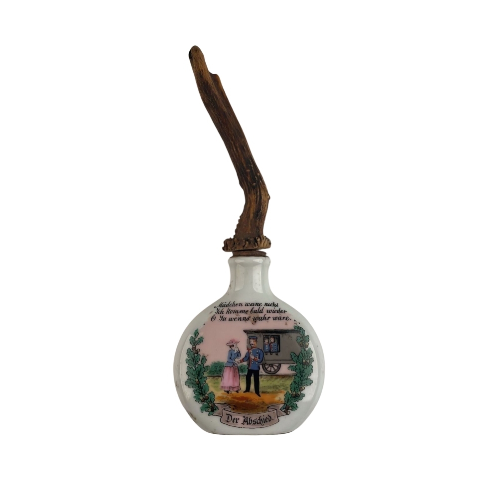 Piccola fiaschetta decorata a scene di caserma, tappo di corno di capriolo. In ottimo stato