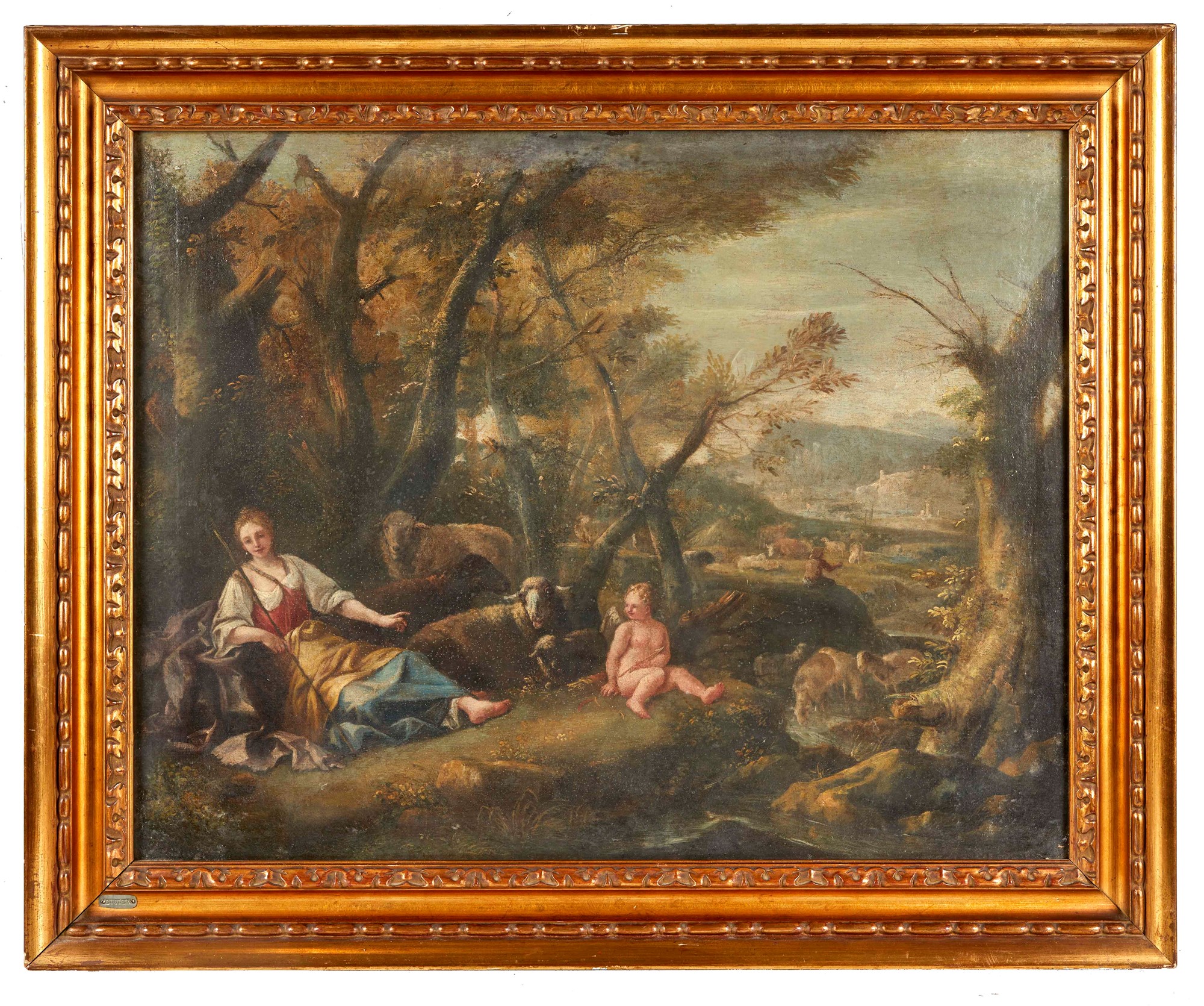 Maestro del XVII secolo, "Paesaggio con figure". Olio su tela. Cm 50x64.