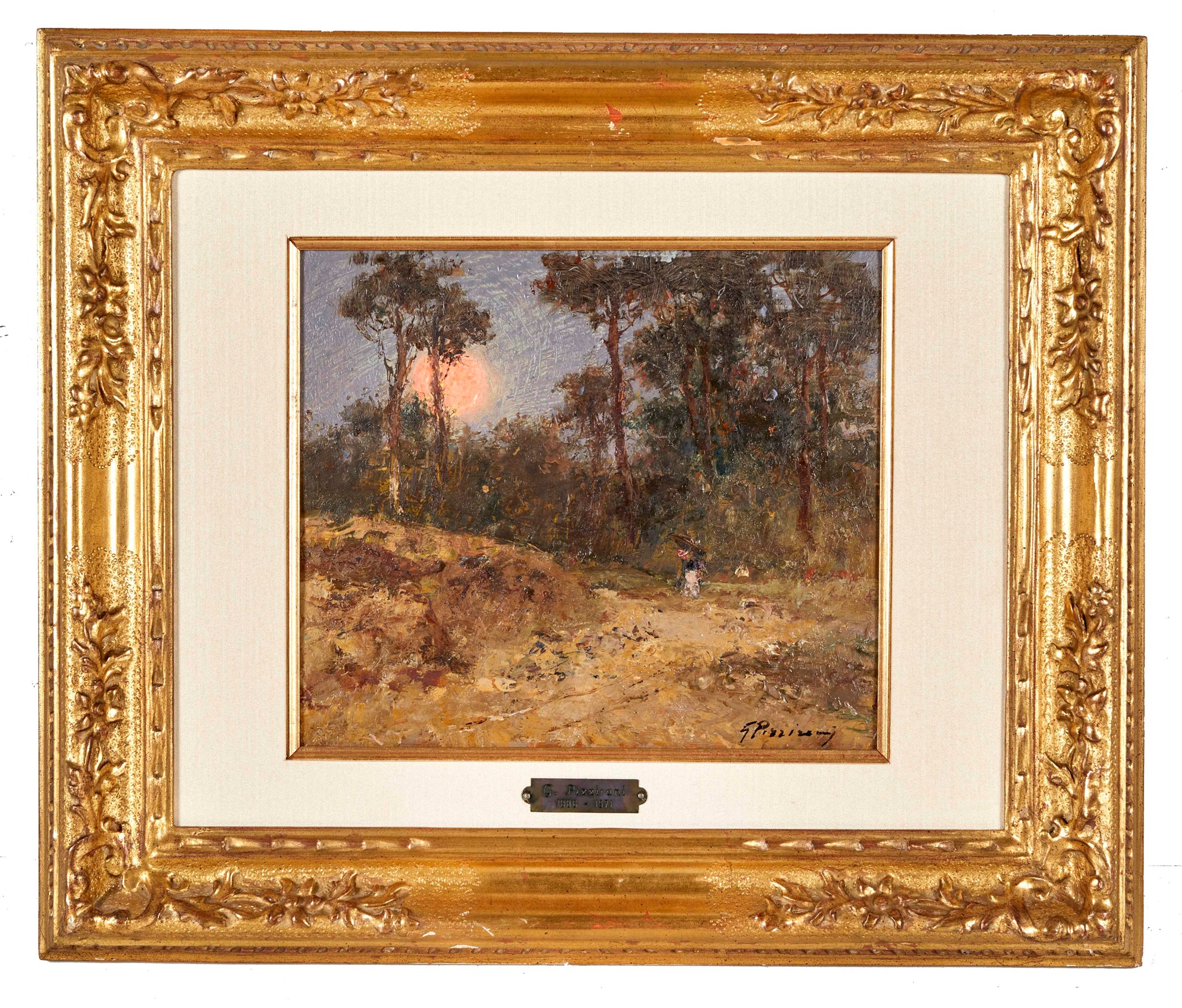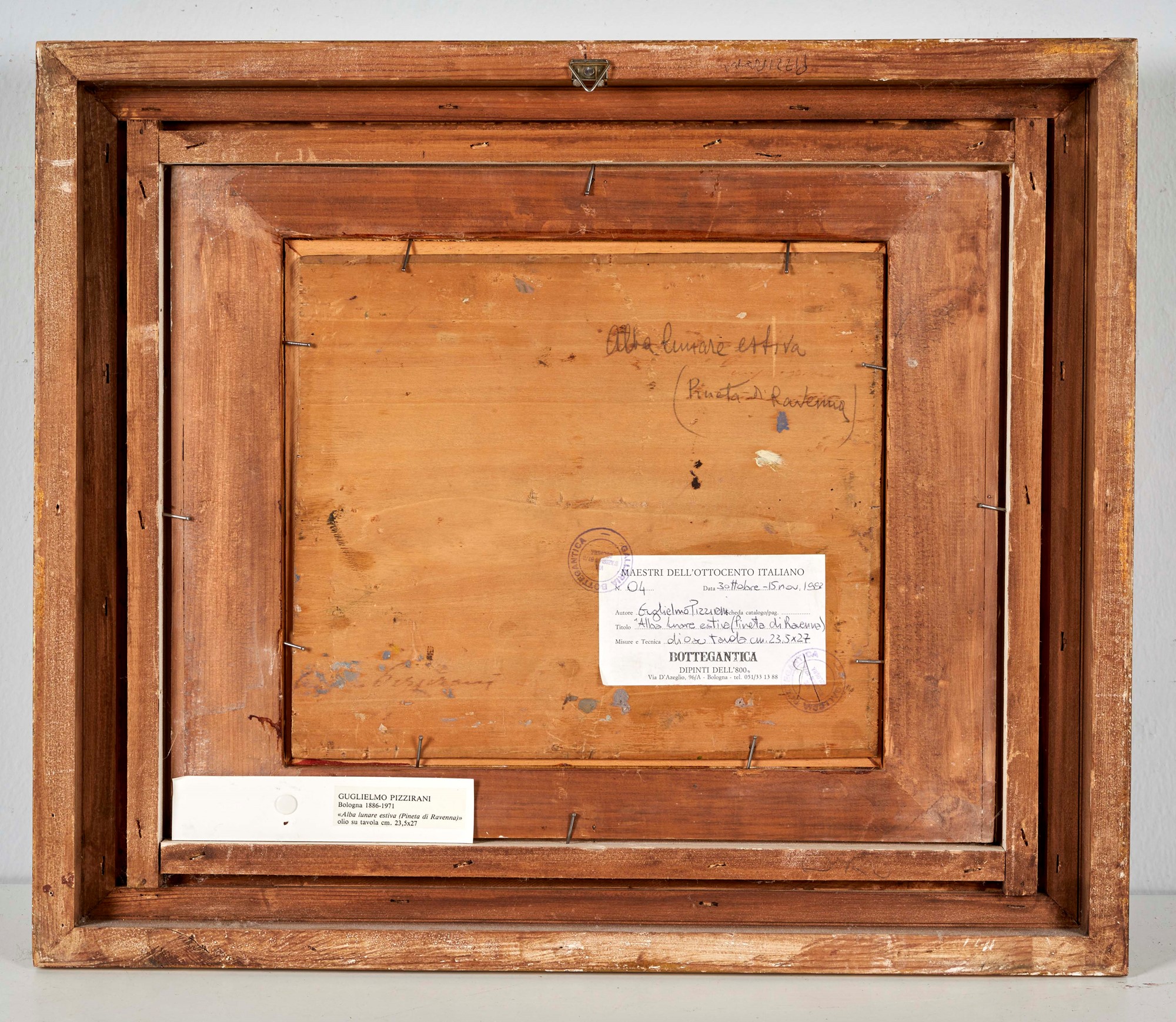 GUGLIELMO PIZZIRANI (Bologna 1886 - 1971) "Alba lunare estiva (Pineta di Ravenna)". 1922-25. Olio su tavola. Cm 23,5x27. Opera firmata in basso a destra G. Pizzirani. Al retro opera intitolata Alba lunare estiva (Pineta di Ravenna). Al retro reca etichetta della mostra "Maestri dell'Ottocento Italiano", Galleria Bottegantica, Bologna, 1992. Al retro reca timbro della Galleria Bottegantica, Bologna. Opera accompagnata da autentica su fotografia e da certificato di autenticità della Galleria Bottegantica, firmata da Enzo Savoia in data 14 ottobre 1992.