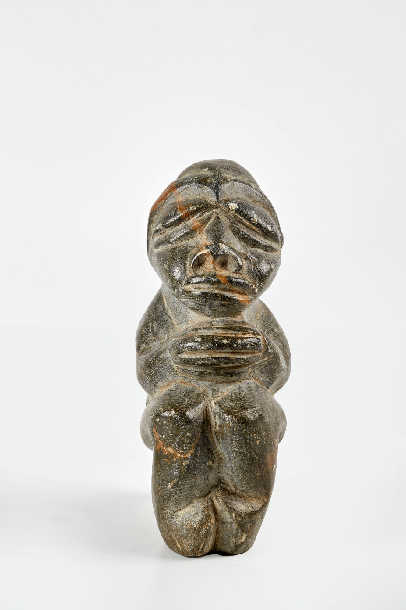 Kissi Pomdo. Scultura antropomorfa in pietra morbida verde. Guinea, Sierra Leone. Prima metà del XX secolo. Cm 14x5. Opera accompagnata da certificato di autenticità con timbro Mondes d'Hier SCS, Bruxelles, e firma di Yvan Guerrin.