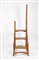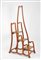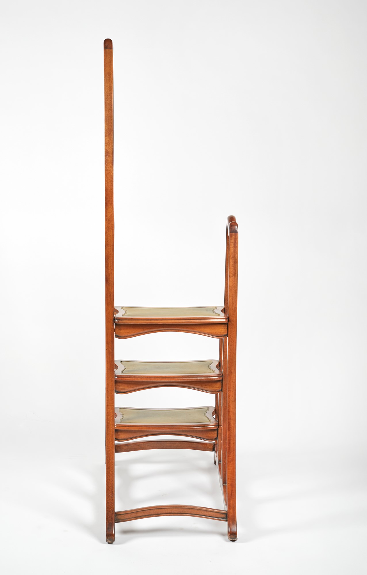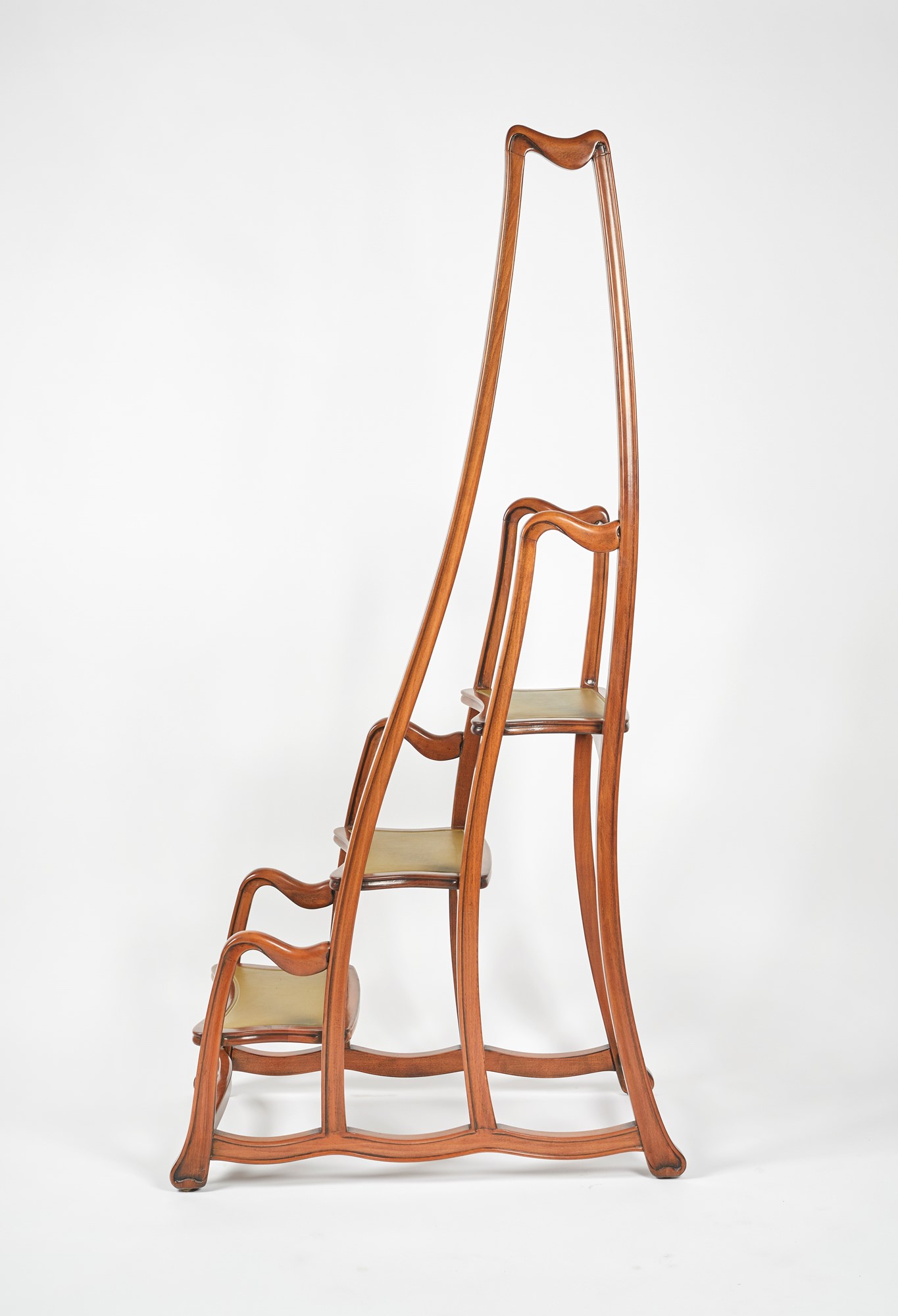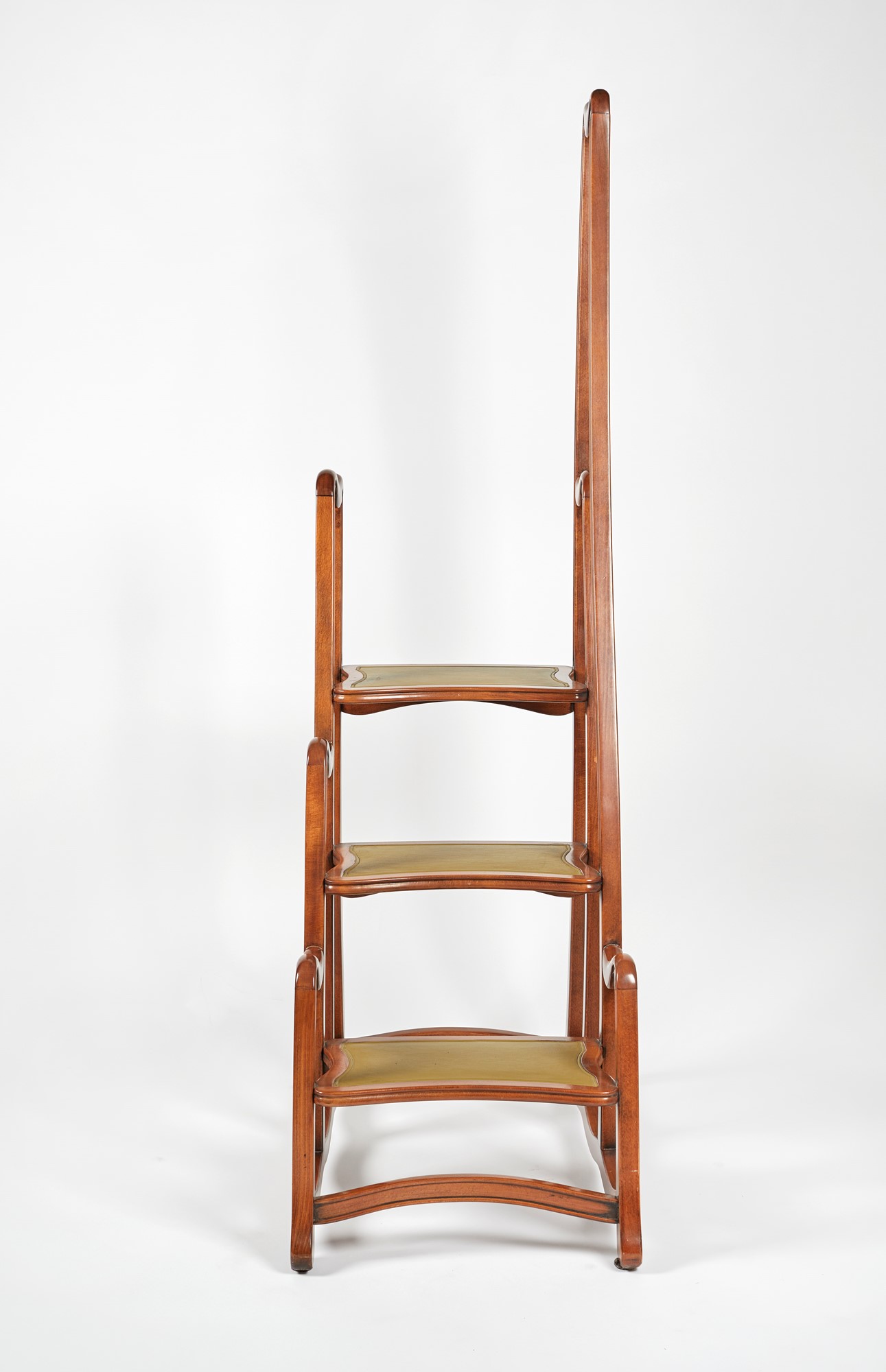 Scaletta da libreria in stile Art Nouveau. Legno intagliato con inserti in pelle lavorata. XX secolo. Cm 167x83x48.